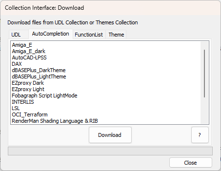 AutoCompletion and FunctionList definitions are associated with a specific UDL, so they can be downloaded along with the UDL (or separately). The Themes are completely separate (from a different Collection), but this interface will work for accessing both.