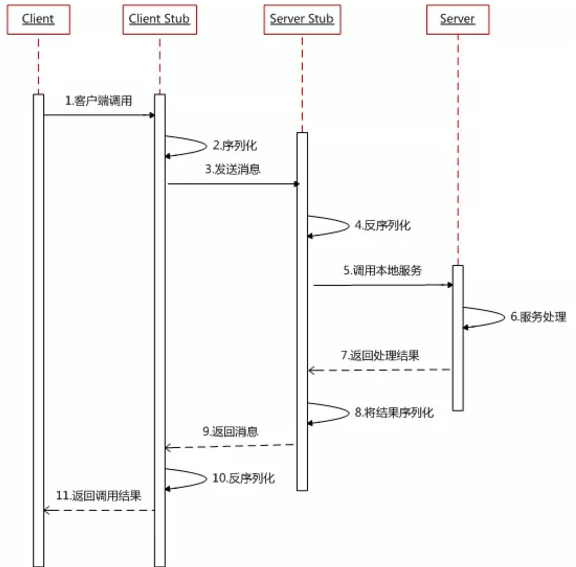 RpcRequest; - 客户端 Stub(client stub) 找到远程服务的地址,并将消息发送到服务提供端;