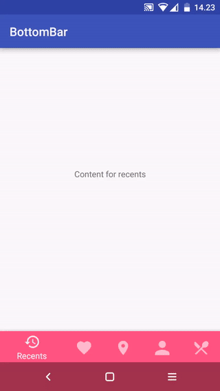 ...Just add barColorWhenSelected to each tab. When that tab is selected, the whole BottomBar background color is changed with a nice animation.