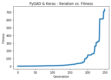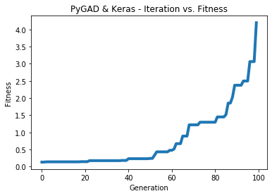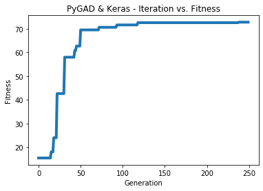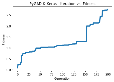 data_outputs = keras.utils.to_categorical(data_outputs)The next figure shows how the fitness value changes.