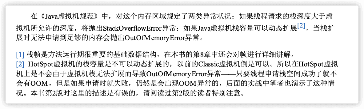 除了 StackOverFlowError 错误之外,栈还可能会出现OutOfMemoryError错误,这是因为如果栈的内存大小可以动态扩展, 如果虚拟机在动态扩展栈时无法申请到足够的内存空间,则抛出OutOfMemoryError异常。