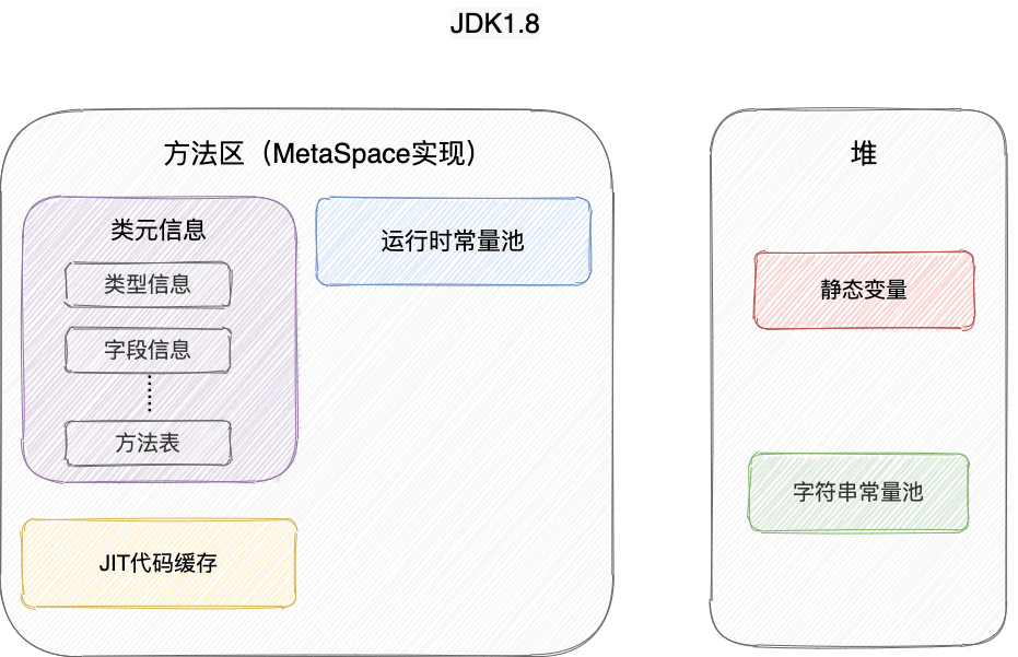 运行时常量池、方法区、字符串常量池这些都是不随虚拟机实现而改变的逻辑概念,是公共且抽象的,Metaspace、Heap 是与具体某种虚拟机实现相关的物理概念,是私有且具体的。