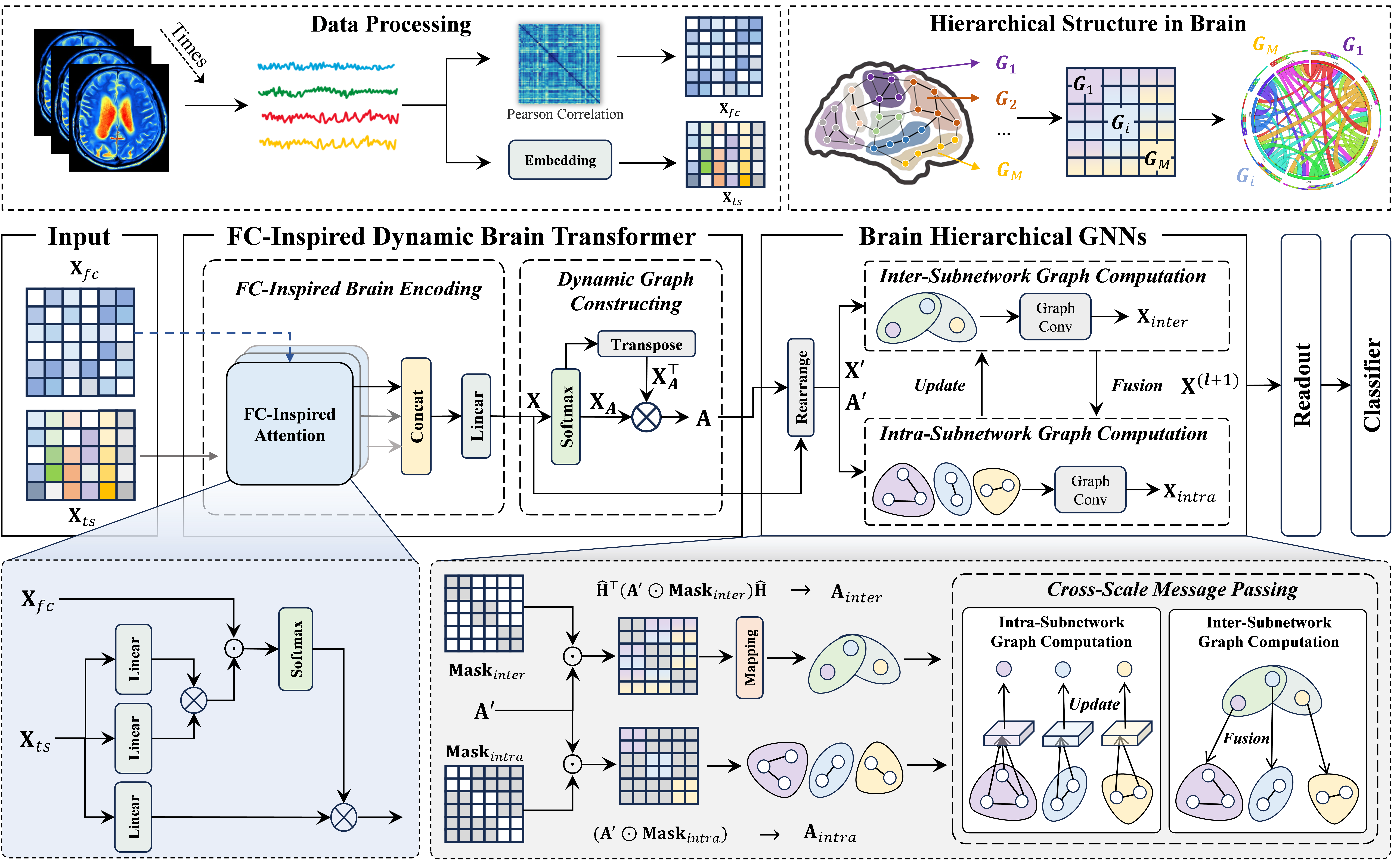 Abstract - The functional brain network exhibits a hierarchical characterized organization, balancing localized specialization with global integration through multi-scale hierarchical connectivity. While graph-based methods have advanced brain network analysis, conventional graph neural networks (GNNs) face interpretational limitations when modeling functional connectivity (FC) that encodes excitatory/inhibitory distinctions, often resorting to oversimplified edge weight transformations. Existing methods usually inadequately represent the brain's hierarchical organization, potentially missing critical information about multi-scale feature interactions. To address these limitations, we propose a novel brain network generation and analysis approach--Dynamic Hierarchical Graph Transformer (DHGFormer). Specifically, our method introduces an FC-inspired dynamic attention mechanism that adaptively encodes brain excitatory/inhibitory connectivity patterns into transformer-based representations, enabling dynamic adjustment of the functional brain network. Furthermore, we design hierarchical GNNs that consider prior functional subnetwork knowledge to capture intra-subnetwork homogeneity and inter-subnetwork heterogeneity, thereby enhancing GNN performance in brain disease diagnosis tasks. Extensive experiments on the ABIDE and ADNI datasets demonstrate that DHGFormer consistently outperforms state-of-the-art methods in diagnosing neurological disorders.