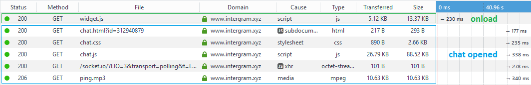 • The chat iframe will only be loaded if the user interacts with the chat widget (currently about 40KB gziped).