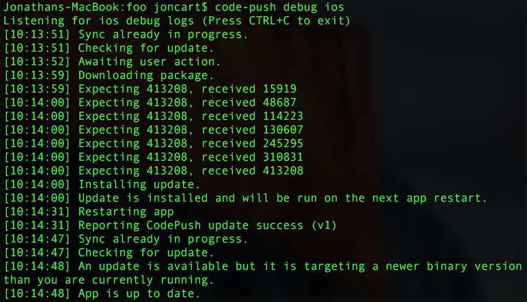 Once you've released an update, React Native plugin has been integrated into your app, it can be helpful to diagnose how the plugin is behaving, especially if you run into an issue and want to understand why. In order to debug the CodePush update discovery experience, you can run the following command in order to easily view the diagnostic logs produced by the CodePush plugin within your app: