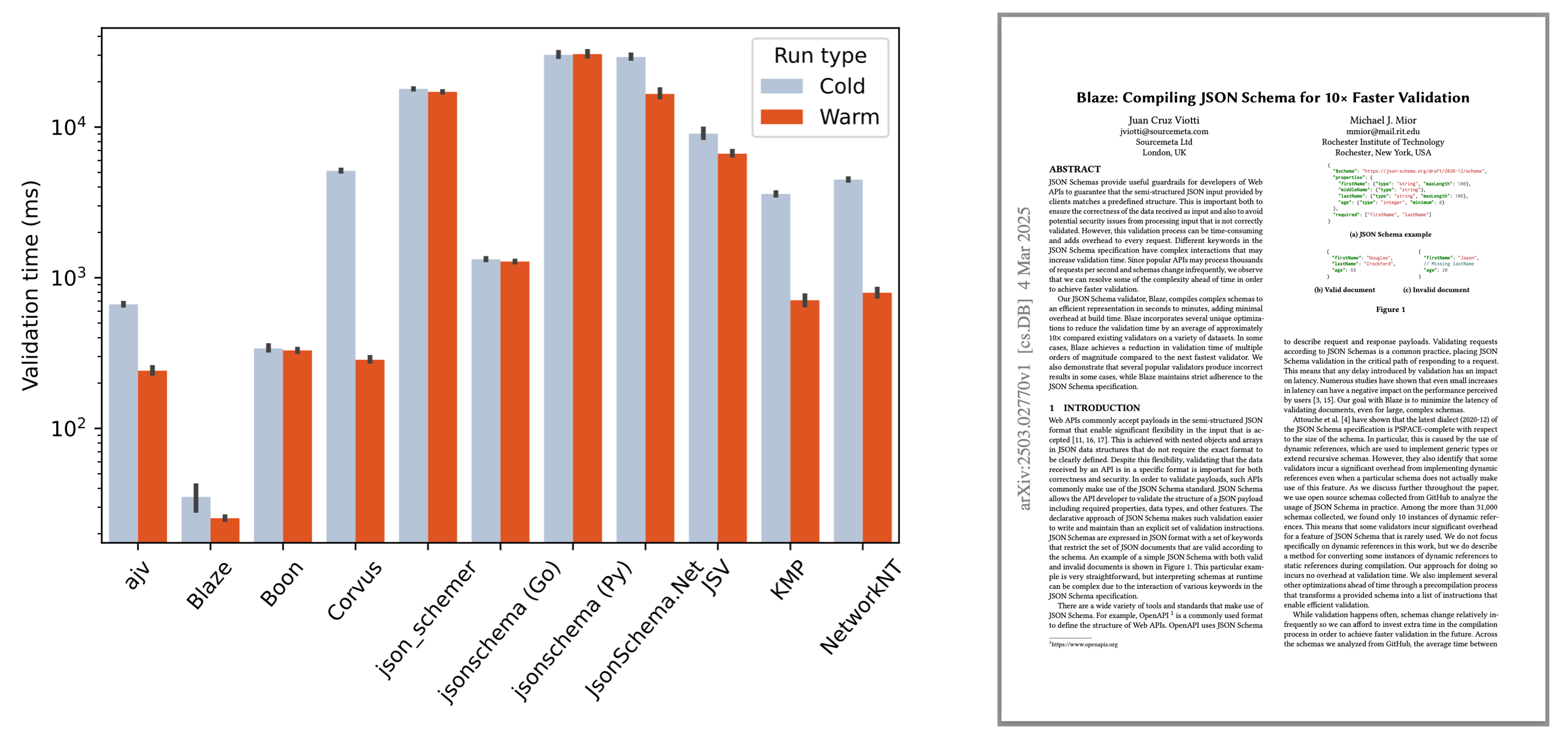 The 2025 paper Blaze: Compiling JSON Schema for 10x Faster Validation (also published on PVLDB) presents a reproducible benchmark comparing Blaze against a number of popular JSON Schema validators, concluding that Blaze is on average at least 10x faster than competitors given a large set of representative schemas and instances.