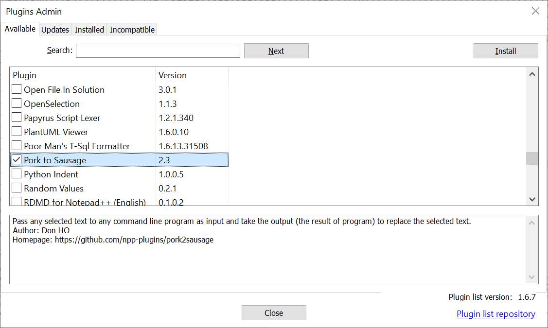 - Incompatible ⇒ Shows plugins you had previously installed but are no longer compatible with Notepad++: