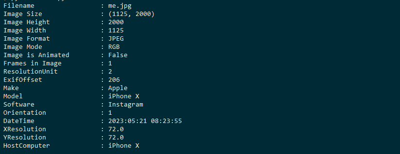 We can see that the given image, which is me.jpg, contains a lot of metadata. This includes the make and model of the device that took the picture. This is Apple’s iPhone X. From this image’s metadata, we already know what device was used to take the picture. This information alone can go a long way in social engineering a target. With that information, attackers can also check for known vulnerabilities attributed to the device to exploit the target (if any).