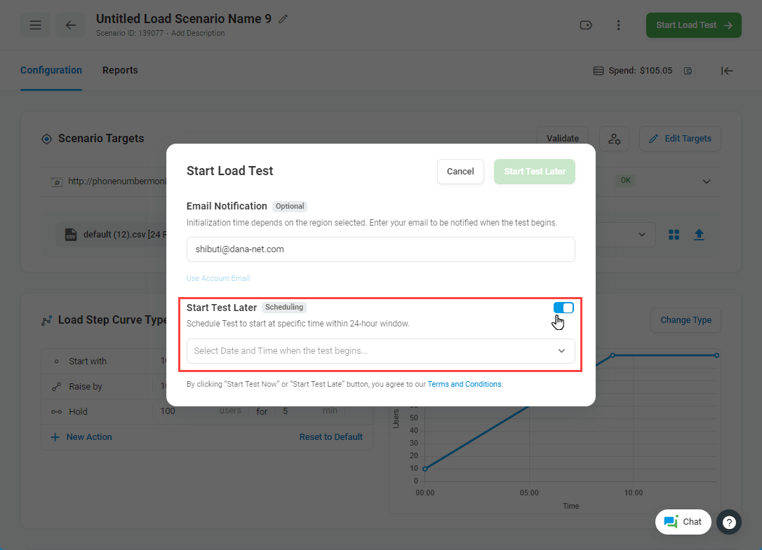 Lors de la mise en place d’un test de charge, vous pouvez sélectionner l’heure à laquelle vous souhaitez commencer le test. L’heure de début peut être choisie dans une fenêtre de 24 heures.