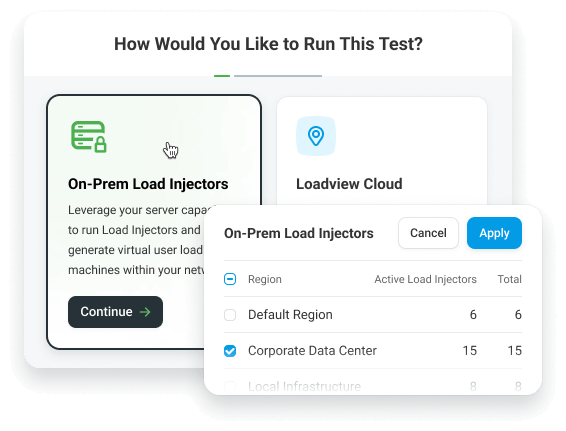 Run LoadView inside your own environment—no external traffic , no public exposure. You manage the infrastructure and network, while LoadView provides the real-browser load testing platform for your internal and regulated applications.