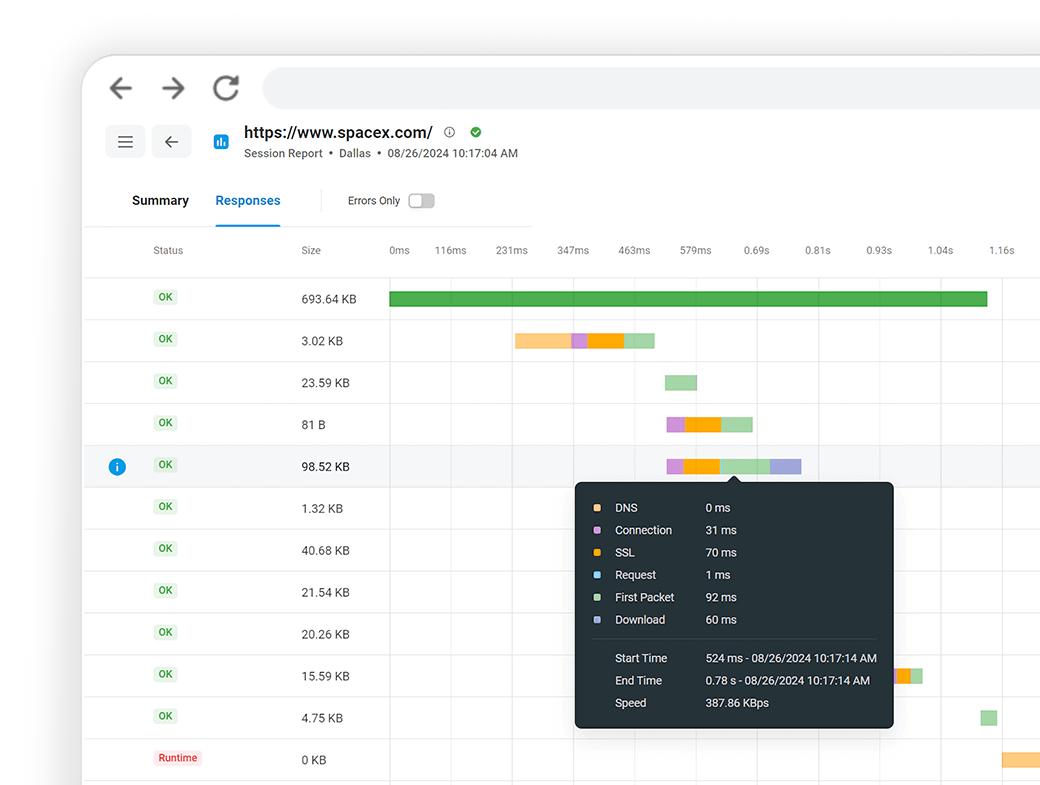 Gain insight into performance metrics that are essential to your organization’s capacity planning. Drill-down into specific session data and performance counters to uncover critical errors that are affecting your websites and applications for a complete view of how your website performs under all load scenarios. LoadView also lets you share your reports so you can easily communicate the results with various internal stakeholders.